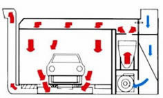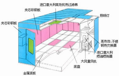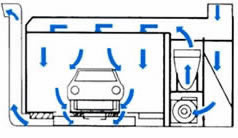 風(fēng)機(jī)將空氣經(jīng)濾網(wǎng)一次過濾后吸入并送至烤房頂部,經(jīng)過濾棉過濾后再次送入烤房,此時(shí)的空氣清潔度可達(dá)98%以上,且送入的空氣具有一定的壓力,可在車的四周形成一恒定的氣流以去除過量的油漆。